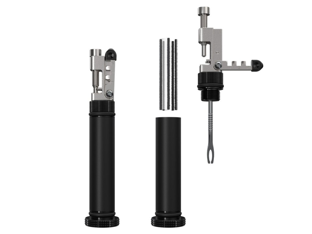 První nářadí zahrnuje nýtovač pro 6-12 rychlostní řetězy spolu s klíči pro bezproblémové centrovaní o velikostech 3,23 mm, 3,30 mm a 3,45 mm. Obsahuje také sadu pro opravu bezdušových plášťů, včetně 5ks knotu bezdušových plášťů o velikosti 3,5x50 mm, aplikátoru a pilníku.