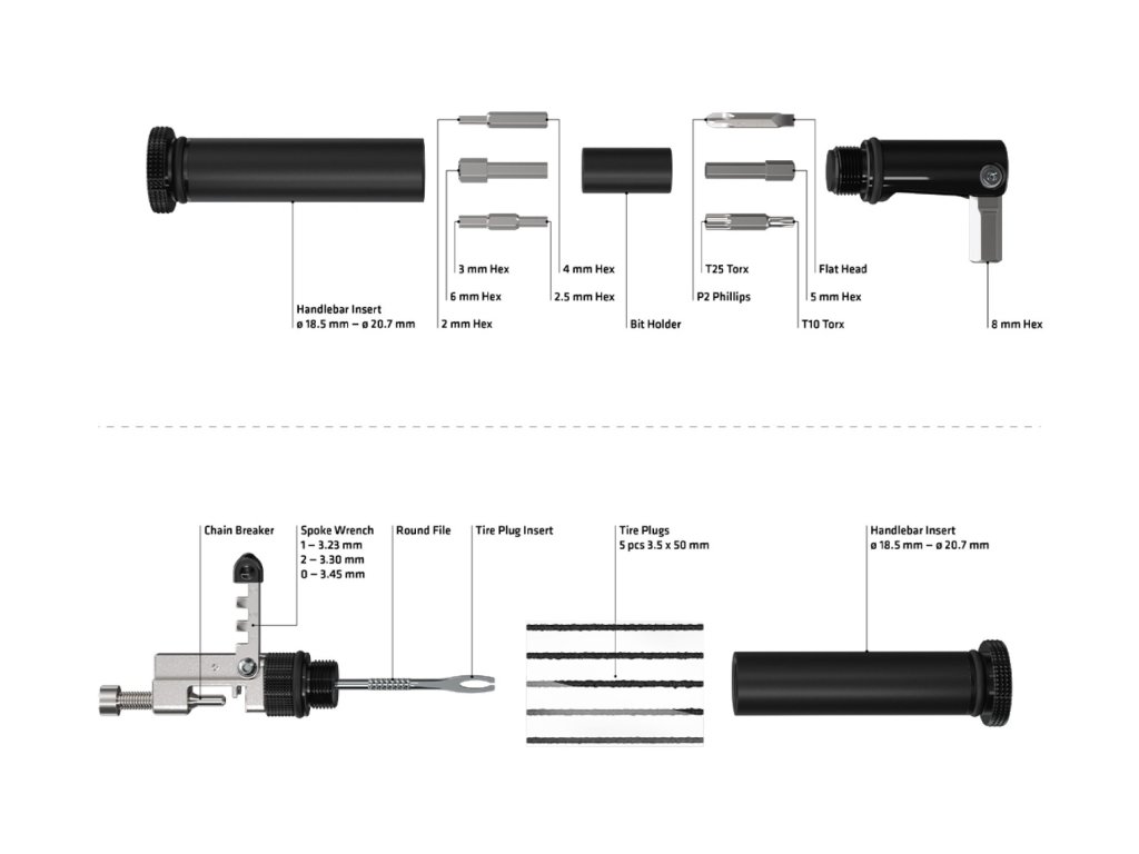Druhé nářadí nabízí ještě více funkcí s úložným prostorem pro 11 bitů, všechny vyrobené z odolné hliníkové slitiny 7075. Sada obsahuje imbusové klíče o velikosti 2 mm až 8 mm, Torx T10 a T25, stejně jako možnosti křížového a plochého šroubováku. Upevnění v řídítkách je zabezpečeno gumovýma kroužkama ve více rozměrech, aby se zajistilo pevné uchycení v řídítkách a zamezilo se tak nepříjemným zvukům.